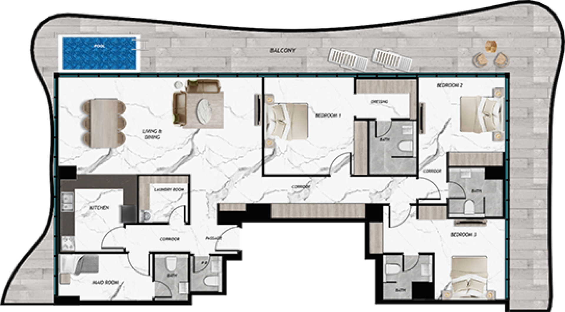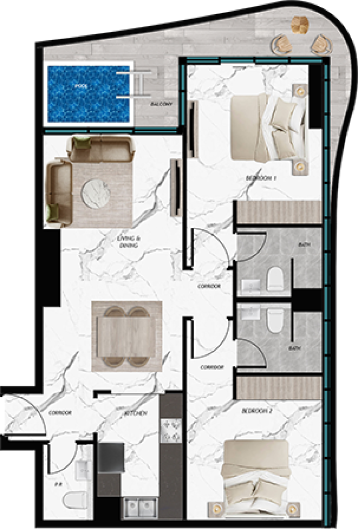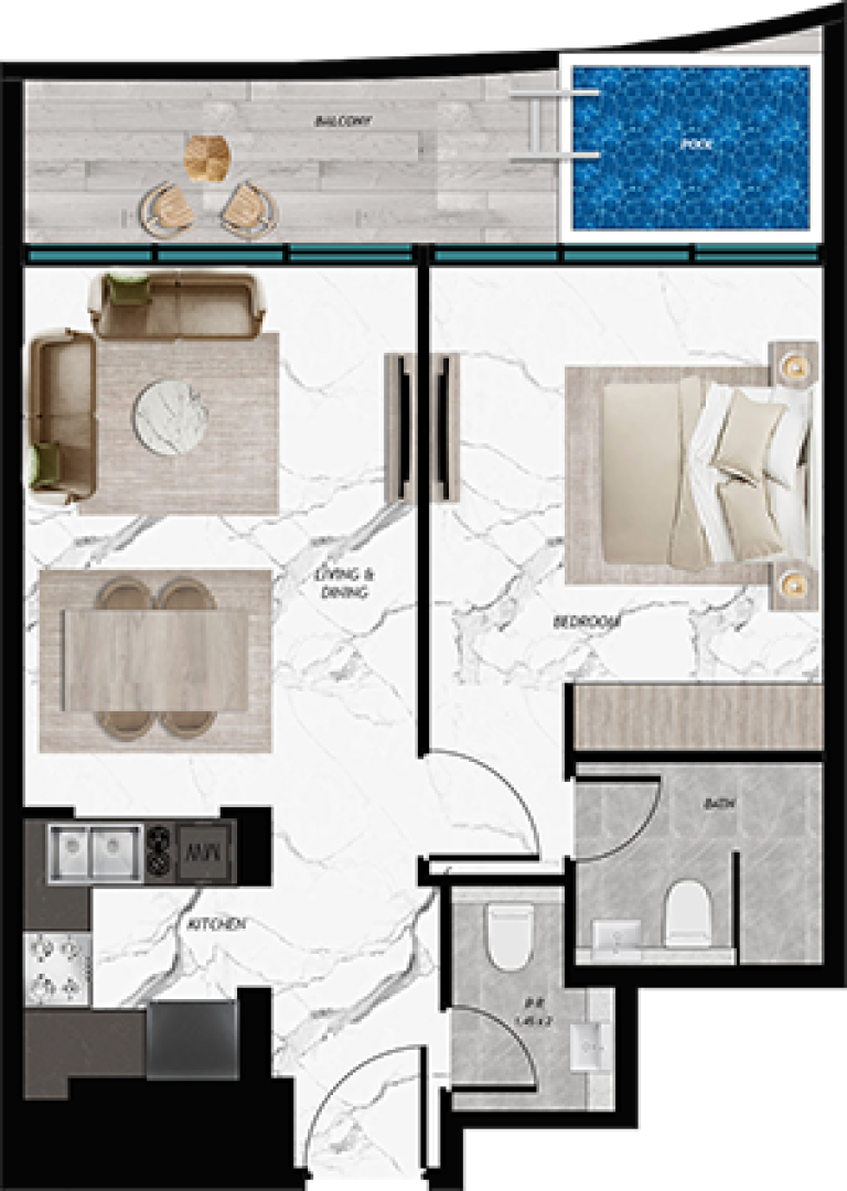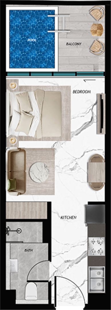 يقدّم المشروع مجموعة من الاستوديوهات وشقق مكونة من غرفة وغرفتين وثلاث غرف نوم، تتميز جميعها بتصاميم داخلية عصرية، وتشطيبات عالية الجودة، ومسابح غطس خاصة تضيف لمسة فريدة من الخصوصية والرفاهية. كما تسمح النوافذ الممتدة من الأرض حتى السقف والشرفات الواسعة بوفرة الإضاءة الطبيعية وتوفّر إطلالات خلابة على المناظر الخضراء والمساحات الخارجية المصممة بعناية.