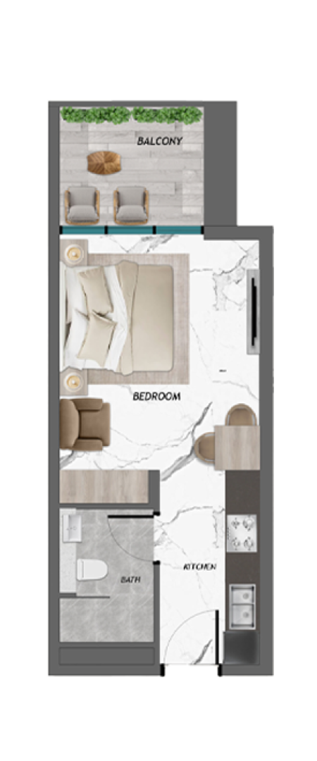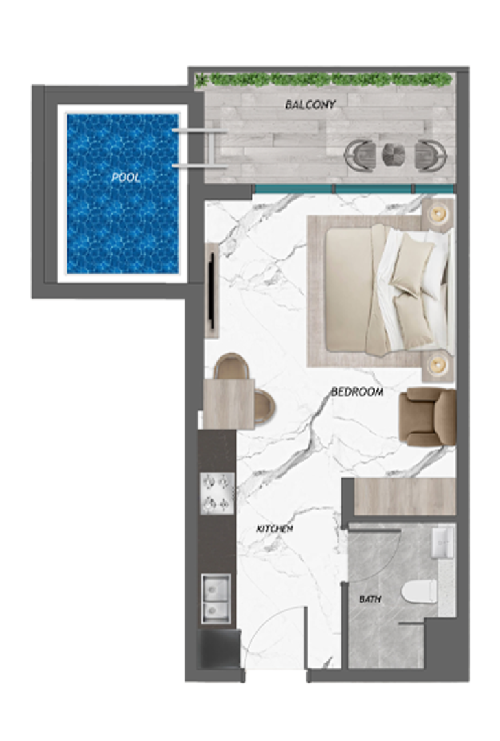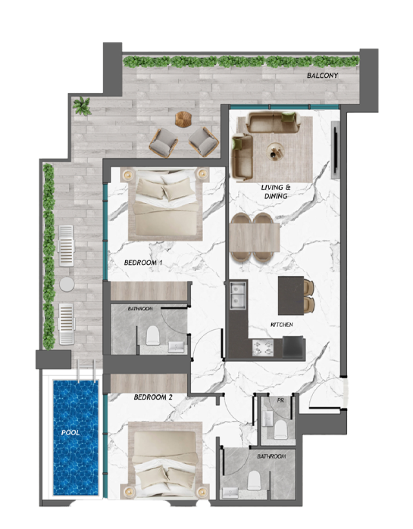 يضم المشروع مجموعة متنوعة من الشقق السكنية تشمل الاستوديوهات وشقق بغرفة نوم واحدة وغرفتين نوم، تم تصميمها بعناية لتحقيق أفضل استغلال للمساحات وتوفير الإضاءة الطبيعية والراحة. وتتميز بعض الوحدات بوجود مسابح خاصة في الشرفات، ما يوفر تجربة سكنية فريدة وخصوصية عالية.