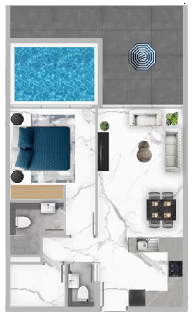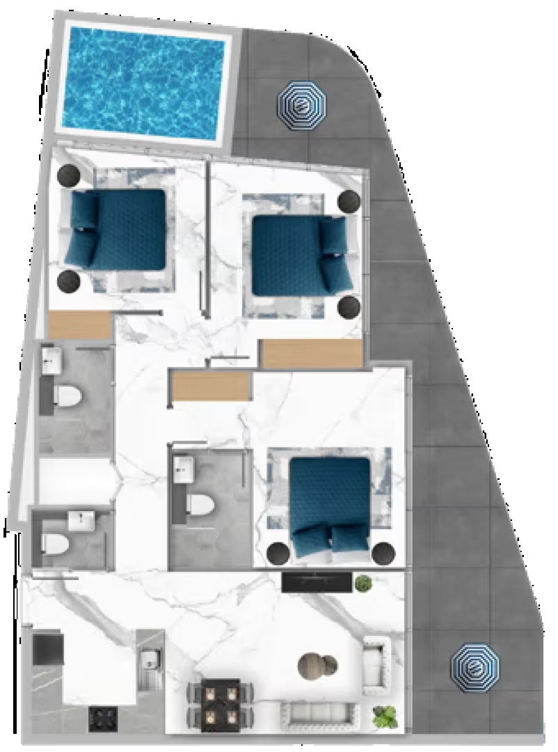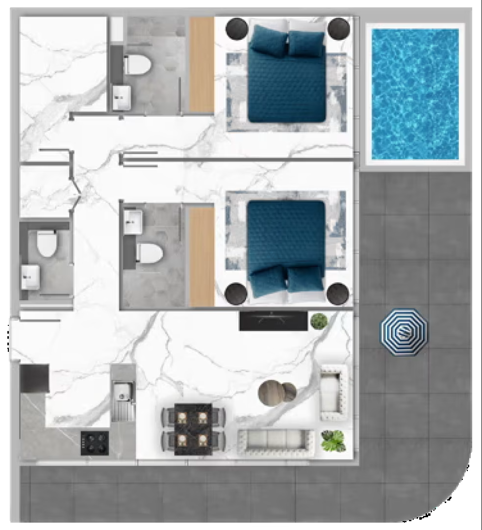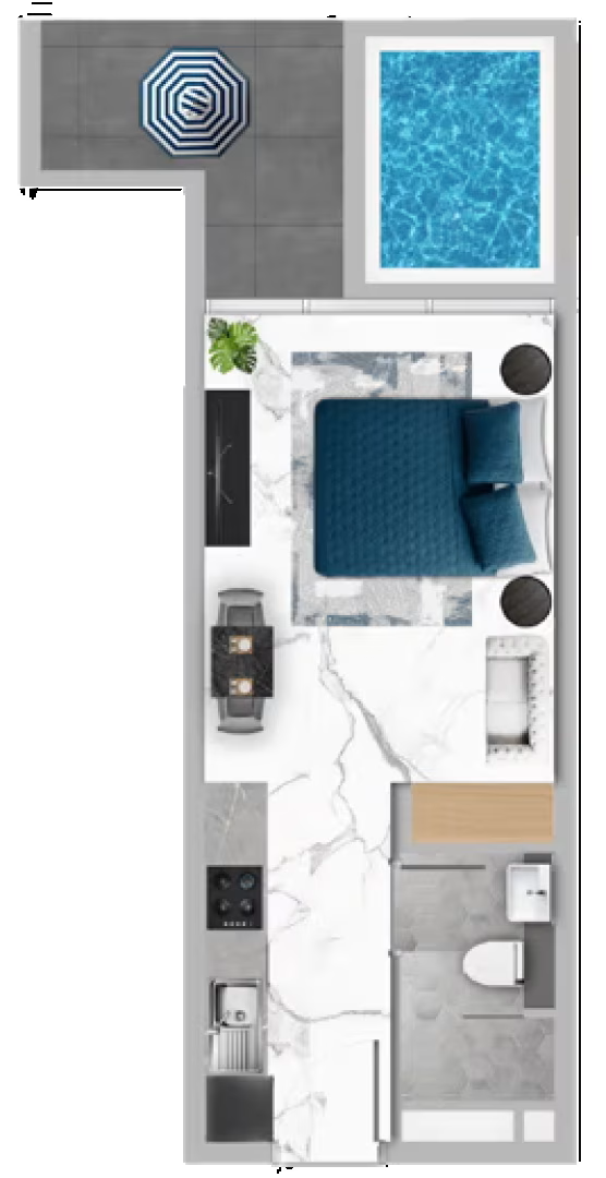 يضم المشروع مجموعة متنوعة من الشقق السكنية تشمل الاستوديوهات وشقق بغرفة نوم واحدة وغرفتين نوم، تم تصميمها بعناية لتحقيق أفضل استغلال للمساحات وتوفير الإضاءة الطبيعية. وتتميز بعض الوحدات بمسابح خاصة في الشرفات، لتمنح السكان تجربة سكنية فاخرة بطابع منتجعي.